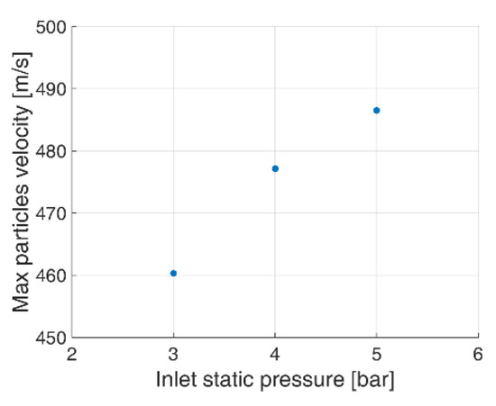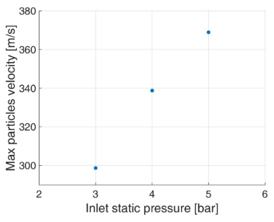 The lowest particle velocity was observed for inlet pressure of 3 bar. Particles speed up with the increase of initial pressure. A correlation between maximum particle velocity and initial total pressure is presented in Figure 18 and Figure 19.