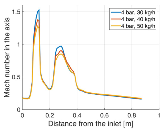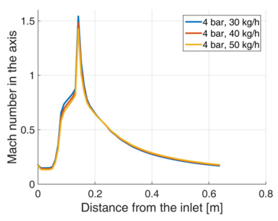 In this section, the influence of dry ice mass flow rate on the flow parameters will be analyzed. Three cases were considered for each geometry: 30 kg/h, 40 kg/h, and 50 kg/h. They were calculated assuming 4 bar for static inlet pressure. As can be observed from Figure 20 and Figure 21 no significant discrepancies in Mach number occur between cases for the selected geometry. Dry ice mass flow rate has a negligible influence on the pressure in the axis (Figure 22 and Figure 23). Maximum particle velocity decreases with growth in dry ice mass flow rate (Figure 24 and Figure 25). The flow is little dependent on the dry-ice mass flow rate as its volumetric concentration in the air is very low but it should be mentioned that even such a small amount of the dispersed phase can influence on the sound velocity in the medium, what means that Mach number in each flow corresponds with a little bit different flow velocities expressed in m/s. This is the explanation for the maximum particles velocity change with the dry ice mass flow rate growth (Figure 24 and Figure 25).