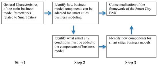 In order to answer the question of how business modeling can be applied to smart cities, we focused on the universally applicable components needed to develop a smart city business model. A narrative, conceptual review of business model frameworks was performed. Then, new business modeling components were proposed for integration in the framework of existing BMCs informed by trends and specificities of smart city solutions. The process was divided into three steps: (1) Identification of the state of the art on business model frameworks that may be a useful starting point for smart cities, (2) categorization of the body of literature according to the components of business model structure and smart cities principles, and (3) synthesis and development of the framework for a smart city value creation canvas for business modeling. This section will develop the steps presented in Figure 1 below.
