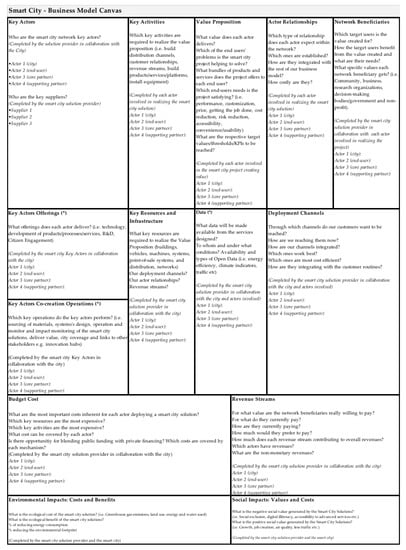 In the Nenonen and Storbacka [] business model framework, operations refer to the firm’s infrastructure, suppliers, and partners, as well as the ICT infrastructure and geographical coverage. In the SC-BMC, the key actors’ co-creation operations refer to the type of operation each network actor can potentially deliver in terms of, i.e., sourcing materials, infrastructure, operation of systems and monitoring impact of the solutions, and creating links with other stakeholders, contributing to the co-creation of delivering a smart city solution and maximizing its impact. For instance, operations allow cities to systematically evaluate the opportunities and weaknesses or gaps that need to be addressed for the successful implementation of the smart city integrated solution. In the Smart City Business Model Canvas, each actor can canvas the type of operations they can incorporate in a systematic way to facilitate the orchestration of those operations. The smart city solution provider can then optimize those operations and utilize them accordingly in collaboration with those actors.