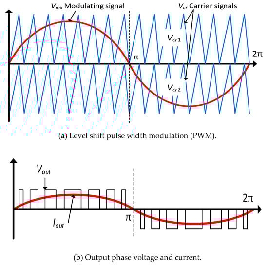 Figure 6a shows the level-shift pulse width modulation (PWM) method for generating the gating pulses of three-level T-type inverter. For n number of levels, the level shift PWM requires (n − 1) carriers with levels shift. In each switching cycle Ts, the modulating signal Vmx is compared to the carrier signals and the corresponding gating pulses are produced. The output-phase voltage, current and the gating pulses of the switches are shown in Figure 6b,c, respectively. It is seen that the switch Sx1 is turned on in the positive half-cycle of Vmx, and the switch Sx4 is turned on in negative half-cycle, whereas the bidirectional switches Sx2 and Sx3 are gated for generating the zero level during the line period. The power switches Sx1 and Sx4 in T-type inverter are designed with full DC-link voltage rating, whereas the switches Sx2 and Sx3 are designed with half DC-link voltage rating.