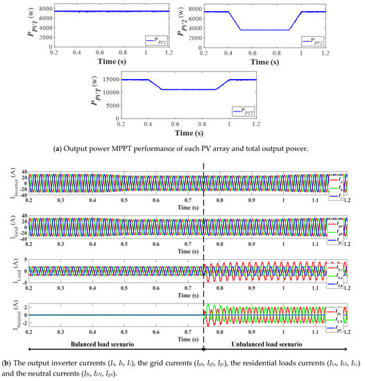 From another side, Figure 10b shows the output currents of the PV inverter (Ia, Ib, Ic), grid injected/absorbed currents (Iga, Igb, Igc), load currents (ILa, ILb, ILc), and neutral conductor currents (Ign, Ifn, ILN). The selected case study is tested at balanced and unbalanced load scenarios as listed in Table 1, wherein the load unbalance occurs at time 0.75 s. It is seen that the proposed system and controller preserve sinusoidal output currents with compensating the load unbalance. The fourth leg of the inverter injects zero current at a balanced load scenario, whereas the proposed inverter injects neutral current at the point of common coupling through the fourth leg with an equal magnitude and opposite direction to the neutral wire of the load. Therefore, the absorbed neutral current from the distribution grid equals to zero, which leads to improving the efficiency of the distribution system. Moreover, the cost of the neutral conductor can be reduced through the use of conductors with smaller cross-sectional area.
