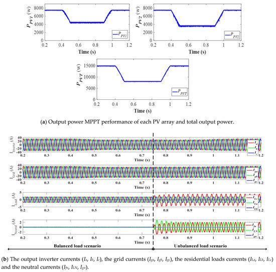The proposed controller is also tested using the selected case study with partial shading on the two arrays at the same time, wherein the upper and lower PV arrays are operated at 500 W/m2. Figure 11a shows the simulation results of the output power of the PV arrays, and the total output PV power. It is seen that the proposed controller has the ability to extract the MPPT of each PV array at normal and partial shading conditions. Both of the PV arrays are operated at their maximum power of 3.75 kW at 500 W/m2 solar irradiance level, whereas each PV generates an output power of 7.5 kW at 1000 W/m2 irradiance.