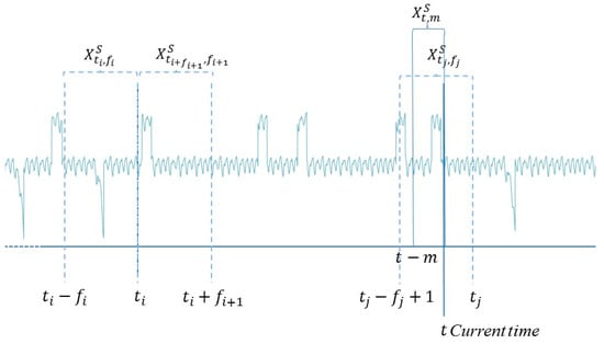 - The input to the model, i.e., the current subsequence acquired in a short time interval ending at the present time ;