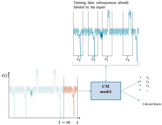The CM model is expected to start operating at time , when no historical data about the energy plant behavior are available. Moreover, the characteristics of the classes change due to the presence of EE and novel classes of anomalies may occur during the plant lifetime. Therefore, the CM model should be able to provide an “I do not know” outcome when asked to classify subsequences of new classes and to incrementally learn from the EE. An expert can be asked to classify historical subsequences with , for an associated cost.