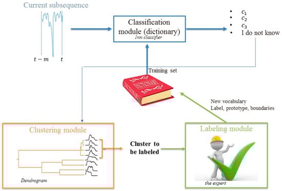 At the present time , the test subsequence , formed by the last collected measurements , is given in an input to the classification module. If the test subsequence is within the boundary of at least one word of the dictionary, it is classified; otherwise, the module provides an “I do not know” outcome and the test subsequence is sent to the clustering module. Once enough examples of similar subsequences are collected, the clustering module creates a new word, , by identifying the cluster prototype and its boundary, defined by the maximum distance, . Then, the labeling module provides the class of the group and the word formed by the triplet prototype, boundary, and class, , is added to the dictionary.