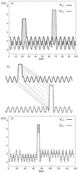 It has been shown that PED works well in very large datasets where there is a large probability of having good matches among subsequences [44] and in the case in which the subsequences are synchronized [45]. For example, the two subsequences reported in Figure 4, with very similar behavior except for the position of the peak, have a relatively large PED value, although they are very similar from the point of view of fault diagnostics. To overtake these limitations of PED, the dynamic time warping (DTW) similarity measure is used in this work [46]. The computation of the DTW between the two subsequences and is based on: