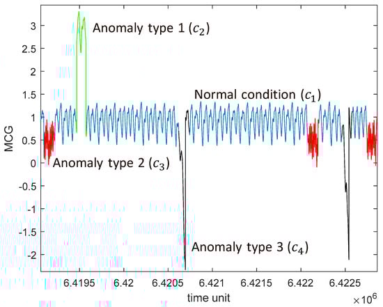 The duration of the anomaly is sampled from a uniform distribution in the range [85,115] time units. For clarification purposes, Figure 6 shows the data stream with examples of anomalies of different classes ( and –anomaly types 1, 2, and 3, respectively) together with the normal condition (). The data stream is simulated for a time interval of time units.