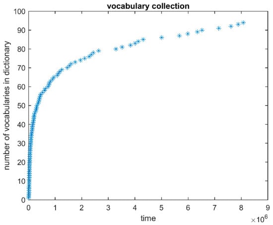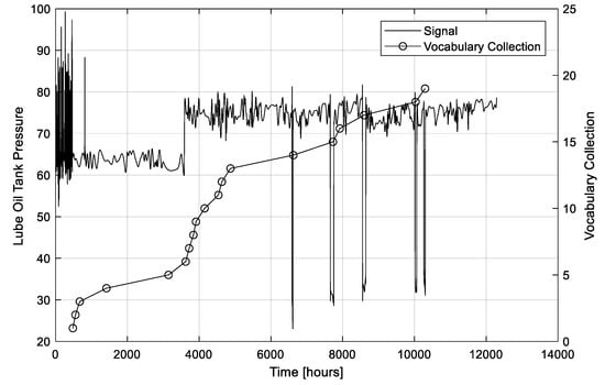 Figure 7 shows the evolution of the number of words in the dictionary as time passes. Notice that at time the dictionary is empty since no information on the process is available. Therefore, the first subsequences are sent directly to the clustering module and the first dictionary word is created at time , when the dendrogram is full for the first time. As the process goes on, more and more words, representing prototypical subsequences of the four classes, are added to the dictionary. As expected, the rate with which words are added to the dictionary decreases as time passes and only nine words are added to the dictionary in the second half of the experiment from time to the end.