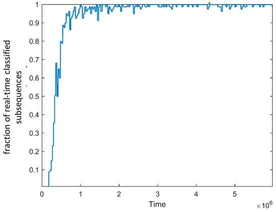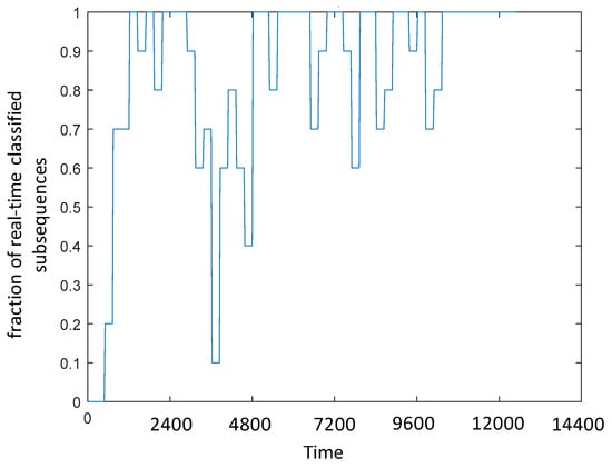 With respect to the “I do not know” classification outcomes, the model is not able to online classify 1.35% of the total subsequences, given the lack of representative words in the dictionary at the time in which it was required to classify them. As expected, Figure 8 shows that the majority of the subsequences are not classified online at the beginning of the experiment, when the dictionary is empty, whereas, as time passes, the percentage of online classification increases and tend to be 100%.