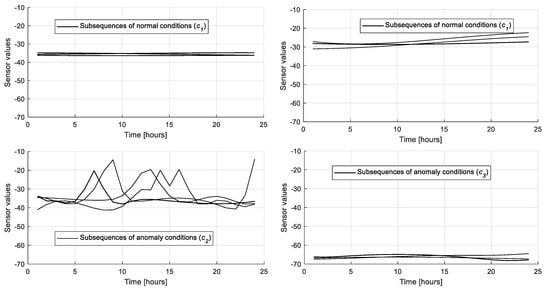 Assuming that i-1 subsequences are already present in the dictionary, once a cluster is identified by the clustering module, a prototypical subsequence is randomly selected among those of the cluster and indicated as . An expert is, then, asked to assign a label to the subsequence, which can correspond to normal conditions (), an anomaly of a class previously identified or an anomaly of a new class . Finally, the threshold of the i-th word, , is computed as the maximum DTW distance between the prototype and the other subsequences in the cluster, and the triplet is added to the dictionary.