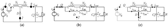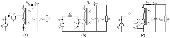 Figure 4c), the active switch is turned off while the diode freewheels the magnetizing current to the output through the