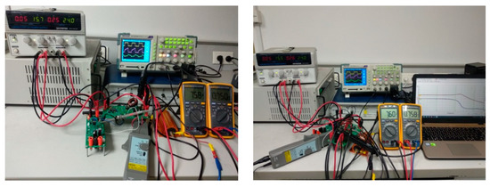 The inductors’ resistance was measured as rL = 0.08 Ohm; the switch on resistance of the MOSFET (30N06B), is ron = 0.025 Ohm; and the diodes’ (MBR40250) forward resistance is predicted by the measured switch-on voltage drop and current which is rF = 1.12 Ohm. Plugging the aforementioned parameters into Equation (17) yields r = 0.67 Ohm.