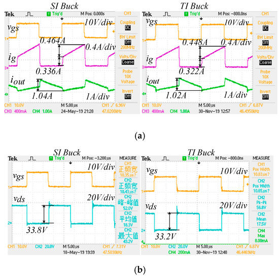 The parameters of the benchmark SIBk converter were at CCM and at discontinuous conduction mode (DCM),, D = 0.5, R = 10 Ohm, Co = 47 μF, fS = 50 kHz. The equivalent TIBk converter parameters calculated by Equations (5) and (6) were and for CCM and for DCM. Zero leakage inductance was assumed.