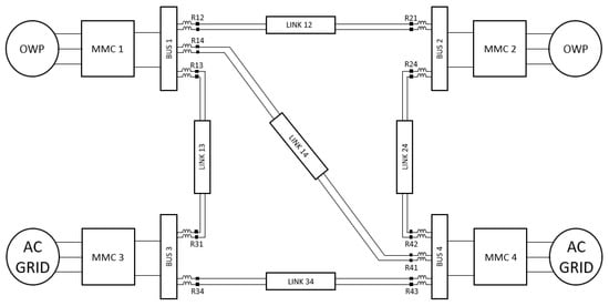 Table 1. Two of the MMCs are connected to offshore wind power plants, the other two to onshore AC grids. Converters 1, 2, and 3 have a rated capacity of 900 MVA, whilst converter 4 presents a rated power of 1200 MVA.