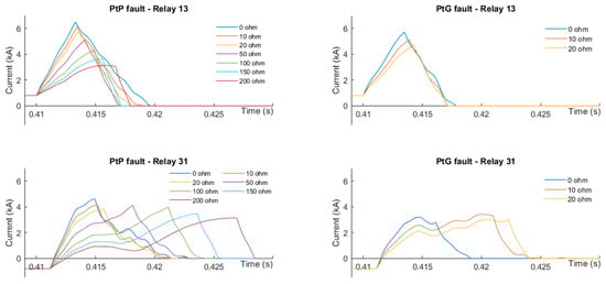 Table 4, both relays need between 0.095 and 1.250 ms to detect a fault since fault inception independently of its type. CB 13 interrupts a maximum current of 6.373 kA for PtP faults and 5.848 kA for PtG faults versus the 4.803 kA and 3.532 kA interrupted by CB 31.
