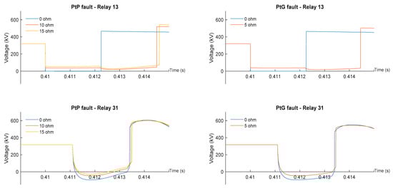 Figure 3 shows the influence of the variation of the fault resistance on the fault-induced voltage drop at both ends of the link. The fault is located in link 13, close to bus 1. Fault inception is at 0.41 s. This algorithm is more problematic on high impedance fault conditions since the minimum value of the voltage drop is severely affected by the fault resistance. The voltage drop might not cross the threshold and it might be interpreted as an external fault. The fault detection is limited to 15 Ω in PtP faults and 5 Ω in PtG faults. In this case, the UV algorithm sensitivity to high impedance faults is worse than the OC algorithm sensitivity.
