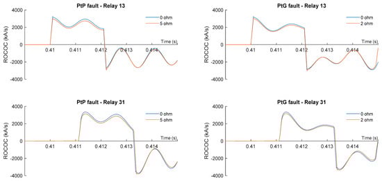 Again, different 0.01 Ω PtP and PtG fault conditions are simulated varying their location through link 13 to analyze the performance of the ROCOC algorithm.