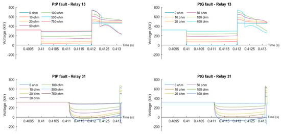 In this section, different PtP and PtG faults are simulated varying the fault resistance. The fault is located close to bus 1, in link 13. Fault inception is at 0.41 s.