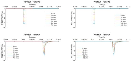 Figure 6. ROCOV algorithm shows great performance detecting high impedance faults. It can detect faults with resistances as high as 750 Ω in the case of PtP faults and as high as 400 Ω in the case of PtG faults.