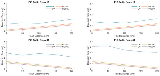 For PtP faults, relay 13 needs between 1.260 and 2.165 ms since fault inception to detect a fault, meanwhile relay 31 is slower and needs between 2.185 and 2.915 ms. Likewise, for PtG faults, the relays need between 1.460 and 2.280 ms, and 3.020 and 4.125 ms, respectively. Relay 31 is slower detecting faults since the current direction at this end of the link is reversed when a fault occurs, as it is shown in