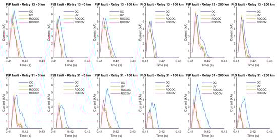 Table 6. Independently of the fault type, both relays need between 0.005 ms and 1.100 ms since fault inception to detect the faults. Once again, CB 13 interrupts higher values of current than CB 31 and these currents are higher in PtP fault conditions than in PtG fault conditions (6.167 kA and 5.590 kA versus 4.591 kA and 3.280 kA).