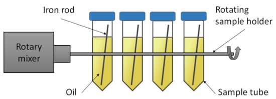 A room temperature immersion test was applied to investigate the corrosion behavior of used cooking oils and non-edible fish oil on an iron rod (length 85 mm and diameter 1.6 mm). The experiments were conducted in test tubes (15 mL) mounted on a rotary mixer, rotating at a constant speed of 56 rpm. The iron rod was placed in a 7 mL oil sample and the test was conducted over a period of 1, 3, 5, and 10 days. During the experiments, the samples were wrapped around with duct tape in order to avoid exposure to light. After the immersion test, the iron rod was separated from the oil and cleaned ultrasonically using a mixture of toluene and 2-propanol (1:1 v/v). The oils from each experiment were subjected to liquid–liquid extraction using 1 mL of sulfuric acid (95%) and 8 mL of deionized water in a test tube, which was then vigorously shaken for 1 min. After the extraction, the mixture was filtered using WhatmanTM quantitative filter paper grade No 42 (ashless, Whatman International Ltd, Maidstone, England) and the aqueous solution was taken for subsequent spectrophotometric analysis. Each experiment was repeated in triplicates. The experimental setup developed in this work for the immersion test is shown in Figure 1.