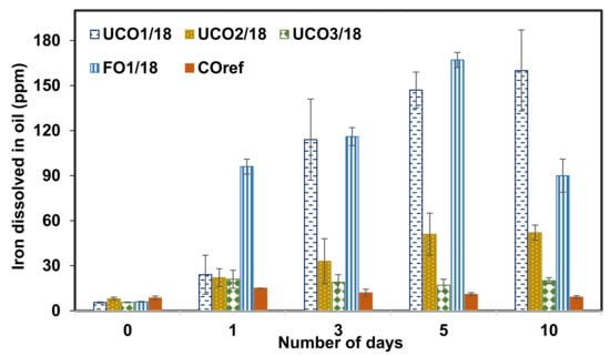 The effect of the immersion time on the total amount of dissolved iron was tested over a period of 0–10 days. As shown in Figure 2, the amount of iron in the cooking oils seems to increase with increasing immersion time. Among the cooking oils, the maximum effect was exhibited by UCO1/18 and UCO2/18, with the highest content of dissolved iron analyzed at 10 days. On the other hand, for UCO3/18 and COref, the amount of dissolved iron did not show any significant change over the course of 1–10 days. The fish oil sample had the highest amount of dissolved iron (170 ppm, 5 days) compared to all the tested oils; however, the iron content started to decrease when increasing the reaction period beyond five days. The relatively high amounts of dissolved iron the fish oil at all time points could be attributed to the chemical properties of the oil; i.e., the high water content and AN (see Table 1). Water content and acid number typically affect the corrosive behavior of oils.