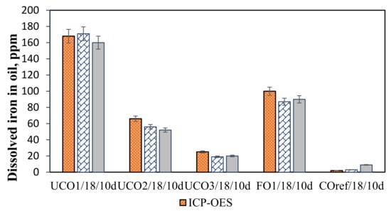 A comparison of iron concentrations in the oil samples after 10 days of immersion was made using spectrophotometry, inductively coupled plasma-optical emission spectrometry (ICP-OES), and inductively coupled plasma-mass spectrometry (ICP-MS). As shown in Figure 3, the iron concentrations measured with the spectrophotometric method corresponded well with those measured with ICP-OES and ICP-MS. Since the results for one and the same oil using the three methods were of the same level, the spectrophotometric method was selected for the subsequent experiments as it is a relatively cheap method and, according to the two other methods, provided reliable results.