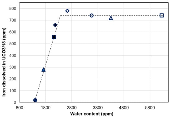 The effect of water content of the bio-oils on the concentration of dissolved iron was investigated using the UCO3/18 sample. An amount of 240–5130 ppm water was added to an oil sample of 50 g and the concentration of dissolved iron was measured spectrophotometrically after three days of immersion. Water content measurements were conducted using the Karl Fischer (KF) titration method. The concentration of iron as a function of the water content in the oil is shown in Figure 4. Iron in the oil increased with the water content up to around 2600 ppm, after which the iron concentration was constant, thus indicating saturation as shown in Figure 4. In general, the water content of the bio-oils has shown to have a direct effect on the amount of iron dissolved, thus enhancing the corrosive property of the bio-oils.