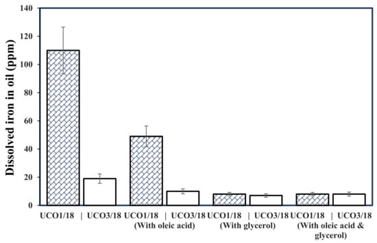 The addition of glycerol showed a more profound effect than oleic acid, resulting in 92% and 63% reduction in the amount of dissolved iron in UCO1/18 and UCO3/18, respectively, as shown in Figure 5. This can be due to the fact that glycerol is miscible in water and through microemulsions keeping the water away from the iron rod [27]. The combined effect of oleic acid and glycerol resulted in comparable values of dissolved iron to those obtained when glycerol was used without oleic acid. Besides its binding effect toward water molecules, glycerol can form microemulsion in the presence of a surfactant such as oleic acid [27]. The formation of a microemulsion produces a thermodynamically stable dispersion system that might have less risk of phase separation in the long term use of bio-oils. It has also been reported that blending glycerol into diesel or gasoline through microemulsification reduced problems associated with stand-alone glycerol fuel use [28,29]. Moreover, glycerol-in-diesel emulsion performed well without fail while showing positive effects on the reduction of unwanted combustion emissions [28,29]. In general, both oleic acid and glycerol considerably reduced the amount of iron dissolved in the oil phase; however, a more predominant effect was observed with glycerol than with oleic acid when protecting the iron rod from corrosion.