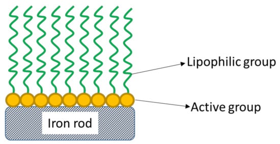 The effect of oleic acid and glycerol on the amount of dissolved iron after three days of immersion of iron was investigated using the UCO1/18 and UCO3/18 oils (see Figure 5). For this study, oleic acid (21 mg/g oil) and glycerol (2.31 mg/g oil) were added to give the total units 50 mg/g oil of free fatty acids for UCO1/18 and 68 mg/g oil for UCO3/18. In addition, the combined effect of oleic acid and glycerol (3:1 molar ratio) on the amount of dissolved iron in the UCOs was investigated. According to Figure 5, the addition of oleic acid resulted in a 57% reduction of dissolved iron in both UCOs. Despite a significant reduction in the concentration of iron, the acid number of the used cooking oils was found to increase by almost 50% due to the addition of oleic acid. In contrast to the trends seen for the acid number and water content of the original oils (Table 1), an increase in the acid number did not enhance the dissolution of iron in the oils with added oleic acid. It was assumed that the active surface group in oleic acid had formed a protective film layer at the surface of the iron rod (see Figure 6). The self-assembled monolayer might furthermore prevent corrosion by inhibiting the permeation of both water and oxygen, thus protecting the metal surface from the exposure to the corrosive environment. This is also in agreement with results from the literature according to which surfactants such as oleic acid can be used for protection against corrosion, owing to their ability to form monolayers on the surface of metals [26]. However, it is worth noting that at very low concentrations of oleic acid/surfactants, adsorption of the corrosion inhibitor might be insufficient to form a monolayer, thus allowing corrosion to occur.