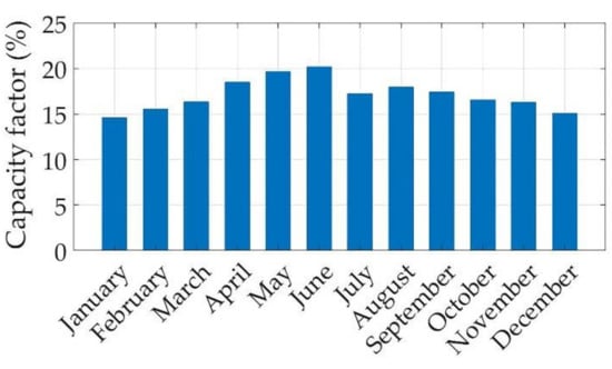 The normalized pattern of the output power of PV systems obtained from the practical data of Ratchaburi Province, Thailand, was used in the calculation throughout the planning project, as shown in Figure 2. Figure 3 shows the average capacity factor of 5 houses for 12 months (September 2017 to October 2018), which was obtained from the practical data in the local area. The average capacity factor of the winter, summer, and rainy season was 15.37, 18.16, and 17.84, respectively. In addition, it is noted that the worst impact of the PV system on the distribution system occurred during the sunny day where the PV systems generate over demand energy. The maximum PV output was limited by 80% of rated PV systems. Therefore, the PV output model of the sunny day was represented as a case indicating the worst impact of the PV system on the distribution system.