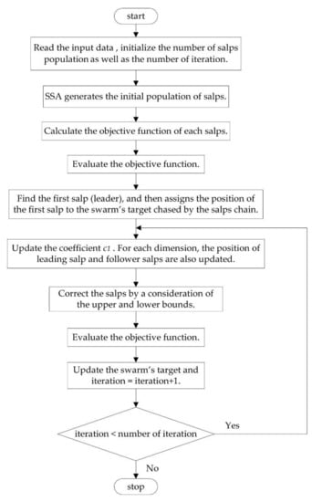 Recently, the optimization algorithm, called Salp Swarm Algorithm (SSA), was proposed to solve the optimization problem []. It was inspired by navigating and foraging behavior of salps in the oceans. In 2018, the notable ability of SSA for locating and optimal sizing of renewable distributed generators and shunt capacitor banks on radial distribution networks was indicated []. Also, several recent studies claimed that SSA indicates an outstanding performance for finding the optimal solution of the power system optimization problem [,,]. However, the use of SSA for solving the optimal installation of BESS and capacitor has not been reported yet. Accordingly, the SSA was purposely performed to solve the optimization problem in this study.