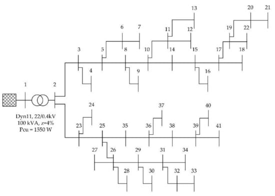 In this paper, the optimal sitting and sizing of BESS were determined by solving the optimization problem aiming to obtain the maximum benefit. It is noted that those parameters were studied only in the case of centralized BESS and centralized BESS with an LV capacitor. The SSA was performed as the main optimization algorithm; meanwhile, the suitability of SSA was discussed by comparing the results to those obtained by the GA. The parameters of SSA used in this study included the population size of 200, iteration of 100, and controlling parameter , where x = 3, l is the current iteration, and L is the maximum number of iterations []. The upper and lower bound of bus locations were 2 and 41. The pre-assigned size of BESS for 3 seasons generated by SSA was 200–800 kWh. The pre-assigned size of BESS on the sunny day was 450–800 kWh. In the case of the centralized BESS with an LV capacitor, the upper and lower bounds of the bus location were 2 and 41, while the sizes of LV capacitors were 5, 10, and 20 kvar. The optimization problem was solved by SSA for 5 runs, and then, the best result was collected. The procedure for finding the optimal sitting and sizing of BESS is summarized in the following steps: