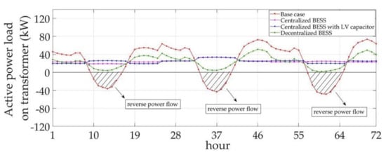 The strategy for charge and discharge of the battery storage system in this work was determined based on the iterative method []. The proposed operation strategy was to flatten the load profile. The optimal sizing and location of BESS were determined through the optimization problem. The load factor of the focused distribution system after the implementation of BESS was assumed to be greater than 0.75. The usage range of the transformer was limited at 80% of its capacity. It is also noted that the size of BESS had to be enough to store the reverse energy occurring during a sunny day.