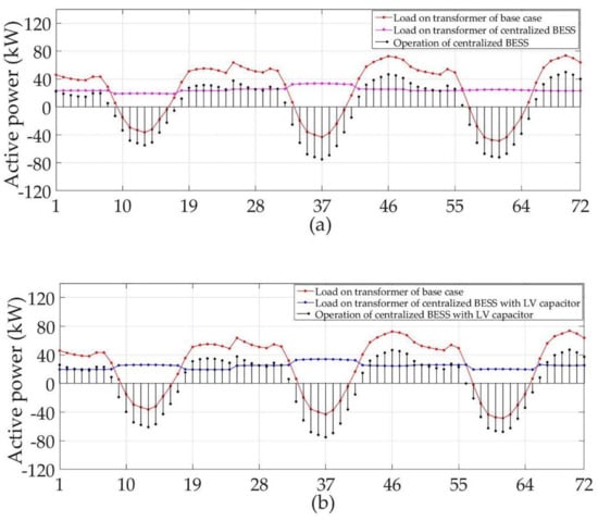 In general, an implementation of BESS, along with PV systems in the distribution system, can provide several benefits to the system. In this paper, we focused on the utility benefits resulting from the implementation of BESS and a capacitor. The difference between implementation types of BESS, including centralized BESS, centralized BESS with LV capacitor, and decentralized BESS, was also taken into account. The considered benefits included the benefit of selling active power , loss reduction , system upgrade deferral , CO2 emission reduction , and deferral construction of a coal-fired power plant . Particularly, it is noted that all profits were achievable for centralized BESS and centralized BESS with LV capacitor installation. On the other hand, the selling active power cost and cost of CO2 emission reduction were unachievable for decentralized BESS installation. In the decentralized BESS case, the benefit of selling active power was non-existent because the active power generated from the PV system was totally stored and used by the customers. In addition, the benefit of CO2 emission reduction, which is obtained from a reduction of coal-fired power plant operation, was non-existent in this case since the energy stored in the decentralized BESS was supposed to be used at each bus and was not related to the operation of coal-fired power plants.