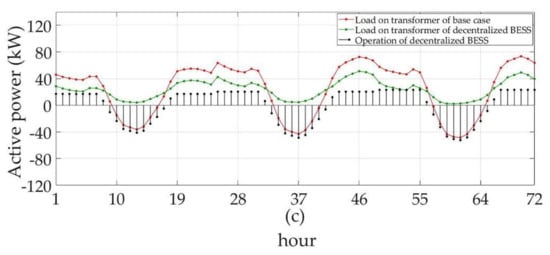 In this paper, the decentralized BESS was owned by the customers; therefore, the customers were responsible for the installation cost of BESS. Accordingly, the investment cost of the utility was ignored in this case. However, the benefits from BESS installation were still taken into account on the utility’s side in terms of loss reduction, system upgrade deferral, and construction deferral of a coal-fired power plant.