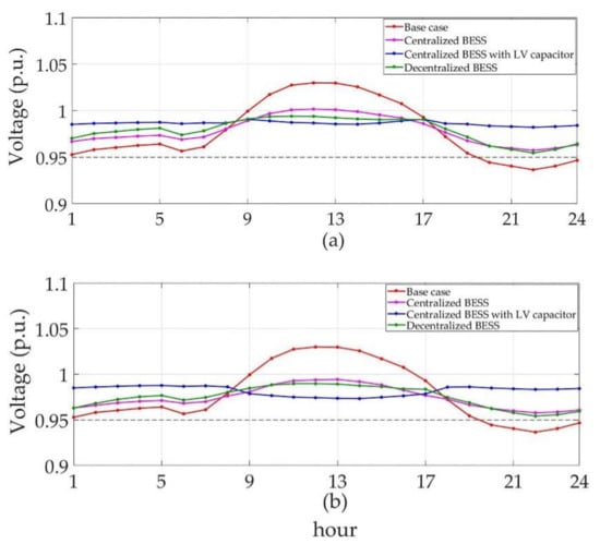 Additionally, installation of a capacitor is widely known as the method for enhancing the economic benefit and enhancing the power quality of the distribution system [,]. Since the capacitor itself normally supplies the reactive power into the distribution system, it typically improves the voltage magnitude as well as reduces the power loss of the system. Several publications have been studied to determine the sitting and sizing of a capacitor aiming to obtain the maximum benefit [,]. However, only a few studies applied the simultaneous installation of capacitor and BESS to maximize the benefit of the distribution system with integrated PV systems [,]. Therefore, an implementation of BESS planning simultaneously with optimal capacitor placement was focused on in this work, aiming to increase the benefit of the distribution system with integrated PV systems. Also, a comparison of BESS installation between the cases with centralized BESS installation, centralized BESS with LV capacitor, and decentralized BESS has not yet been considered in the literature.