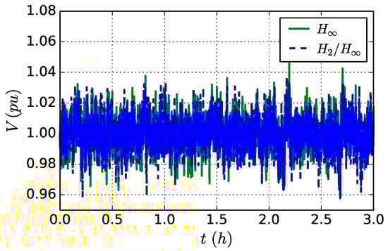 We can observe that in Figure 3, when the proposed mixed controller is applied to the ER system, dynamics of the DC bus voltage deviation are successfully restricted within a small range. Apparently, the voltage regulation performance under the mixed control approach is better than that without control (control output ). It is clear that the proposed control approach has satisfactory performance for the voltage stabilization target.