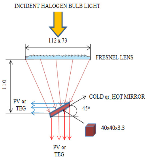 Furthermore, two pieces of solar cells from polycrystalline silicone material were used with specification 0.14 W, 0.5 Vmax, 0.28 Imax, and dimensions 52 × 19 mm in series; therefore, the dimensions were 52 × 38 mm in total. The dimensions of the solar cell were adjusted to the dimensions of the hot mirror and cold mirror used, which was 50 × 50 mm2. For TEG, ceramic material (Bismuth Telluride, SP1848-27145 material) was used with dimensions 40 × 40 × 3.4 mm and operating temperatures of −40 to 150 °C. Meanwhile, to focus the halogen radiation light, a Fresnel lens from polymethylmethacrylate (PMMA) was used with dimensions of 112 × 73 mm and a focal length of 110 mm; the lens was 2 mm thick with 92% light transmission.