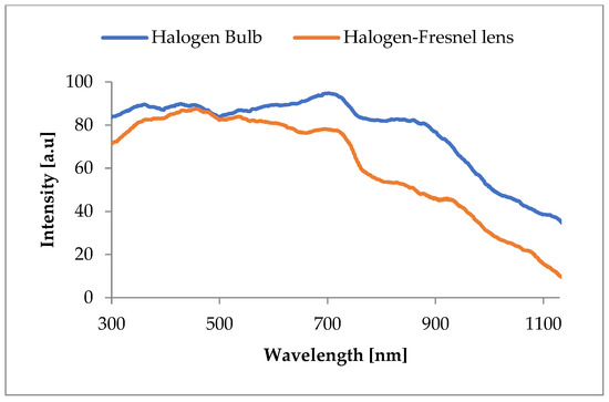 It can be seen from the trends in Table 2 that every halogen light spectrum position shows a declination of intensity. It might have occurred due to the specification of the Fresnel lens, which was only able to transmit light up to 92%, as was explained in Section 2. The ability of the hot mirror and cold mirror to transmit and reflect the light spectrum was also a parameter that affected radiation intensity degradation.