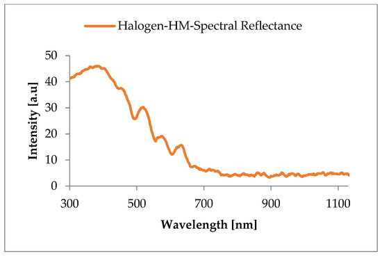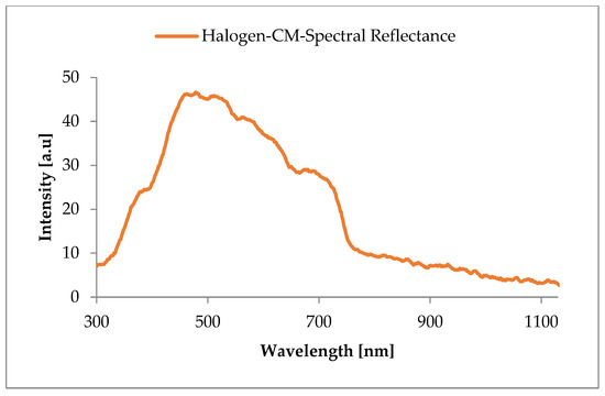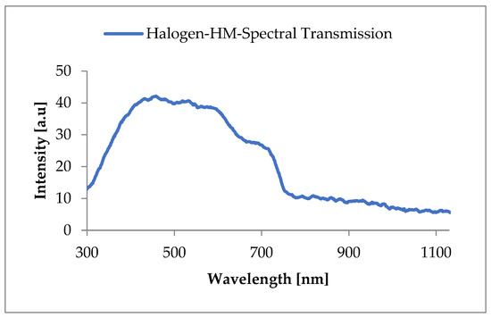Meanwhile, the hot mirror reflected halogen light illustrated a different pattern, as shown in Figure 5, where the area of the intensity curve was relatively smaller. The larger area of the curve indicated greater radiation energy [22]. At visible light intervals (300–750) nm, a quite large intensity only occurred around the 400 nm wavelength, or precisely at 377 nm continuously declining to a wavelength of 749.61 nm. Furthermore, for wavelengths above 750 nm, the intensity that occurred was very small. At wavelengths above 750 nm, the intensity that occurred was also relatively low, as in transmitted light. In short, even though the reflected spectrum of light was much smaller than the transmitted one, the intensity was still relatively high in the range of 300–500 nm, which is still within the limits of visible light.