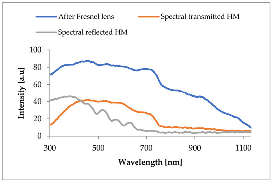 Figure 8 shows a light spectrum that was traversing the Fresnel lens and then transmitted to the PV and reflected to the TEG by the hot mirror. The reduction of intensity was more than 50%, either which was transmitted to the PV or that was reflected to the TEG. As for the example at 435 nm wavelength, the intensity after passing the Fresnel lens showed a number accounting for 86.703 a.u, while light intensity that was transmitted and reflected by HM, decreased, respectively, to 39.35 a.u (same amount on PV and TEG). This change occurred due to the absorption of radiation energy by the light spectrum splitter HM, which eventually affected the power generated by the PV and TEG modules. The other potential cause was the illumination of light radiation that was not 100% facing the HM surface.