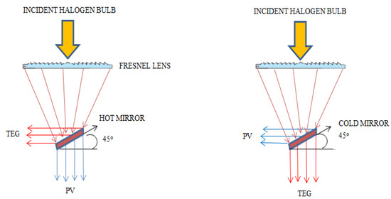From the characteristics of the light spectrum for the hot mirror, as seen in Figure 4 and Figure 5, it appears that the greatest light energy occurred in the visible light region of transmitted light as indicated by the area of the larger intensity curve. Based on these results, the best position of the PV module was under the hot mirror, while the TEG was placed to receive reflected light from the hot mirror (see Figure 8).