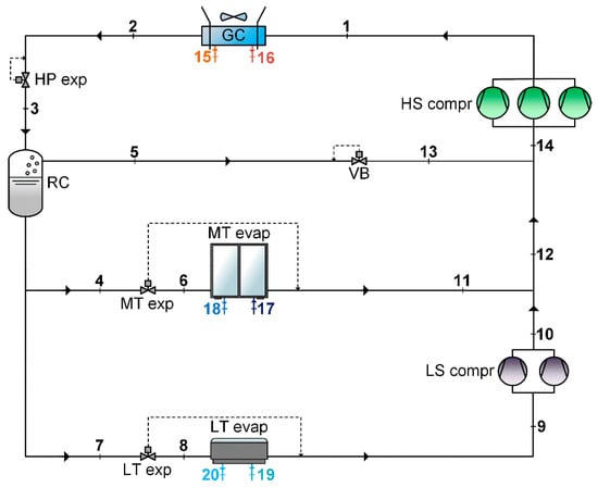 A conventional transcritical R744 booster supermarket refrigeration system (CB) and its p–h diagram are respectively sketched in Figure 1 and Figure 2.