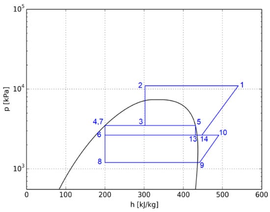 In this solution, the high stage (HS) compressor(s) (HS compr) discharge(s) R744 to the high pressure (HP) (Thermodynamic State 1 in Figure 1 and Figure 2) and thus the heat is rejected into the surroundings through the gas cooler/condenser (GC) (Thermodynamic State 2 in Figure 1 and Figure 2). The refrigerant is then isenthalpically expanded via the HP expansion valve (HP exp) and enters the receiver (RC) (Thermodynamic State 3 in Figure 1 and Figure 2), in which the flow is split into vapor (Thermodynamic State 5 in Figure 1 and Figure 2) and liquid (Thermodynamic State 4 in Figure 1 and Figure 2). Therefore, the liquid is throttled to the medium (MP) (Thermodynamic State 6 in Figure 1) and low pressure (LP) (Thermodynamic State 8 in Figure 1 and Figure 2) to respectively feed the medium (MT) and low (LT) temperature evaporators (i.e., MT evap and LT evap in Figure 1 and Figure 2). The low stage (LS) compressor(s) (LS compr) act(s) as booster(s) and compress(es) the refrigerant coming out of LT evap (Thermodynamic State 9 in Figure 1 and Figure 2) to MP (Thermodynamic State 10 in Figure 1 and Figure 2). The vapor in RC is isenthalpically expanded (Thermodynamic State 13 in Figure 1 and Figure 2) by using the by-pass valve (VB) and mixed with the stream coming from both MT evap and LS compr. Finally, the refrigerant is drawn by the HS compr (Thermodynamic State 14 in Figure 1 and Figure 2) and the thermodynamic cycle is then completed.