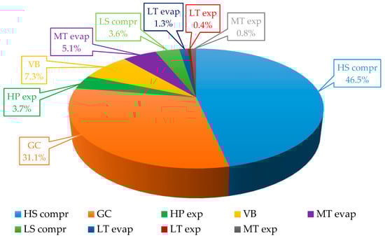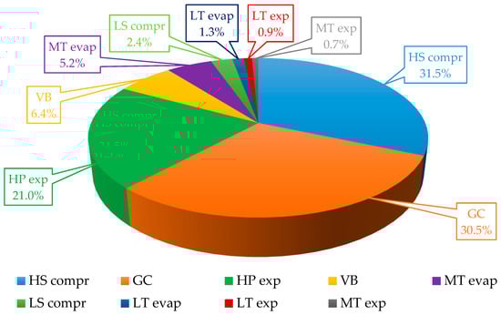 Finally, only 10.9% of the inefficiencies associated with HP exp could be actually avoided, being this component responsible for 48.4% of . On the contrary, HS compr, GC, VB and MT evap were characterized by a greater value of . than that of , being , , and respectively equal to 90.7%, 62.5%, 69.5% and 60.5% of their corresponding exergy destruction rates.