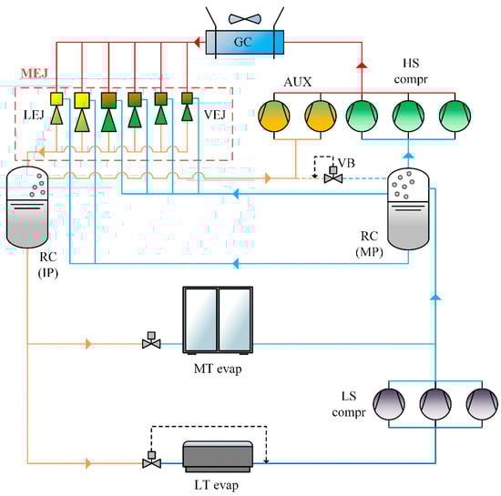 Schematic of a conventional transcritical R744 booster supermarket refrigeration system (CB) (GC: air-cooled R744 gas cooler/condenser; HP exp: high pressure expansion valve; HS compr: high stage compressor rack; VB: vapor by-pass valve; RC: receiver; MT exp: expansion valve (medium temperature); MT evap: evaporates at medium temperature; LT exp: expansion valve (low temperature); LT evap: evaporates at low temperature; LS compr: low stage compressor rack).