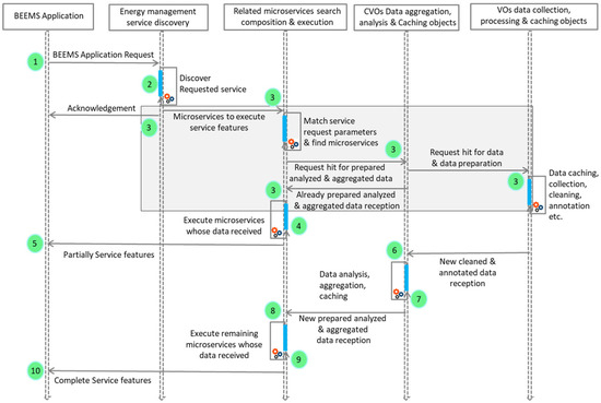 In the model, each data processing and analysis microservice contains relevant CVOs and VOs for data collection, (the data collected from sensors, actuators, buildings, smart meters, and appliances) data caching, data representation, data exploration, data filtration, data aggregation, and data ingestion. A WoO-enabled microservices model that enhances the availability of data and services for BEEMS is shown in Figure 6.